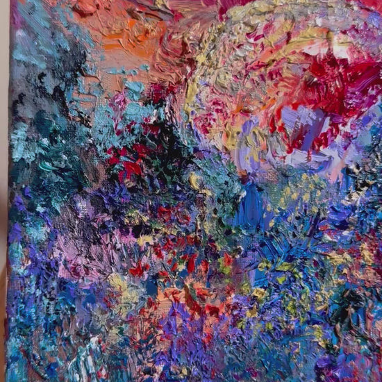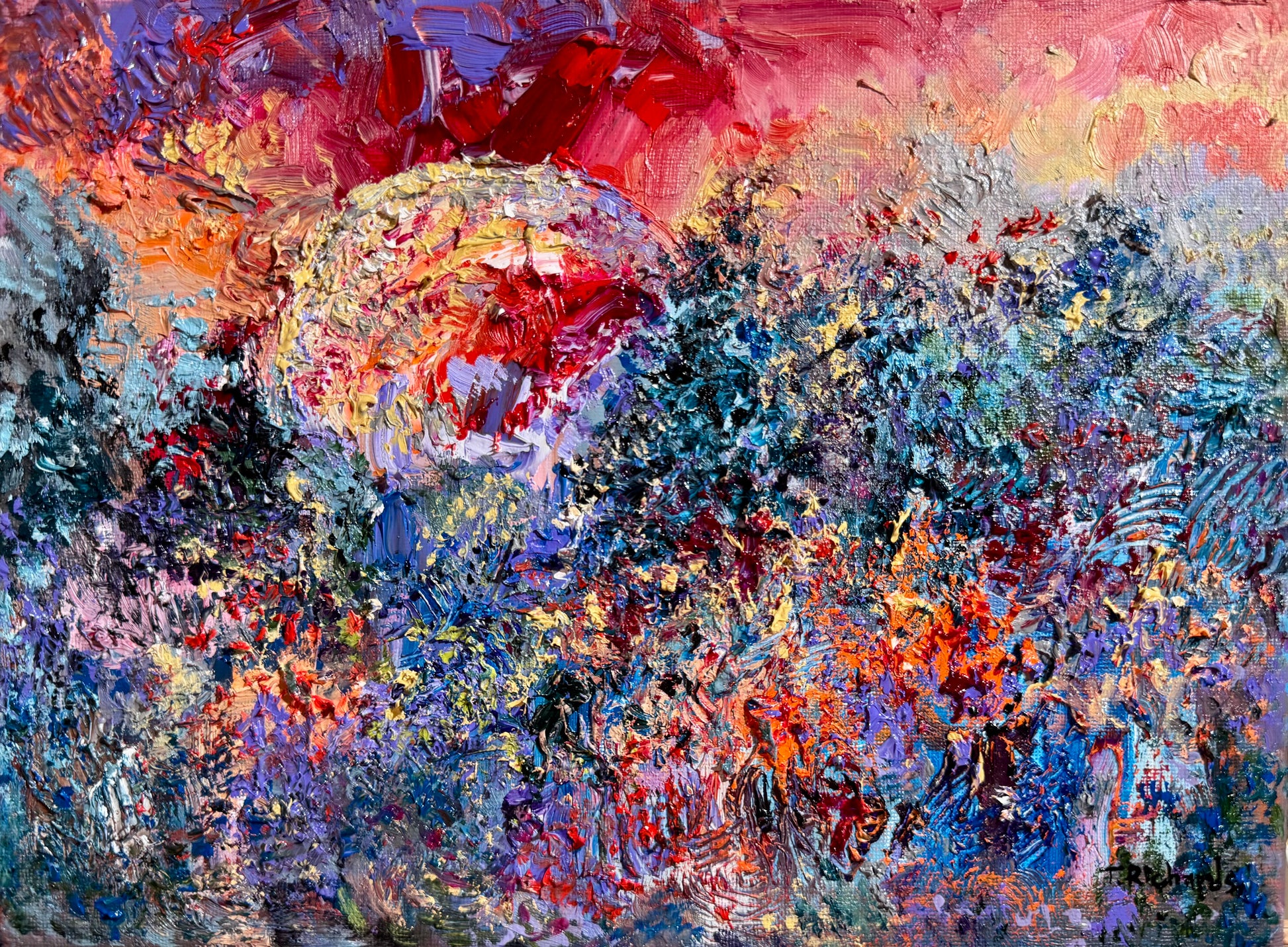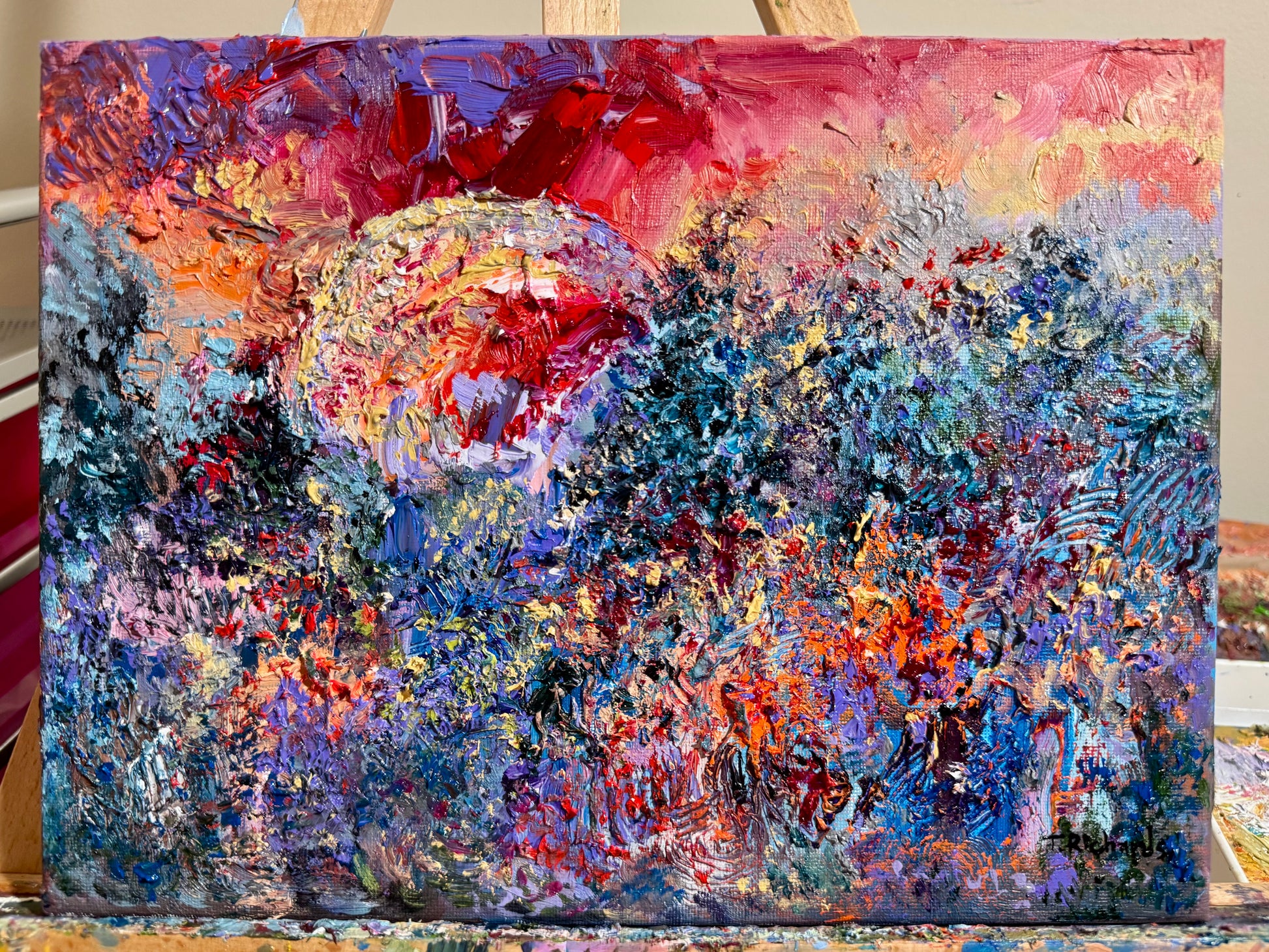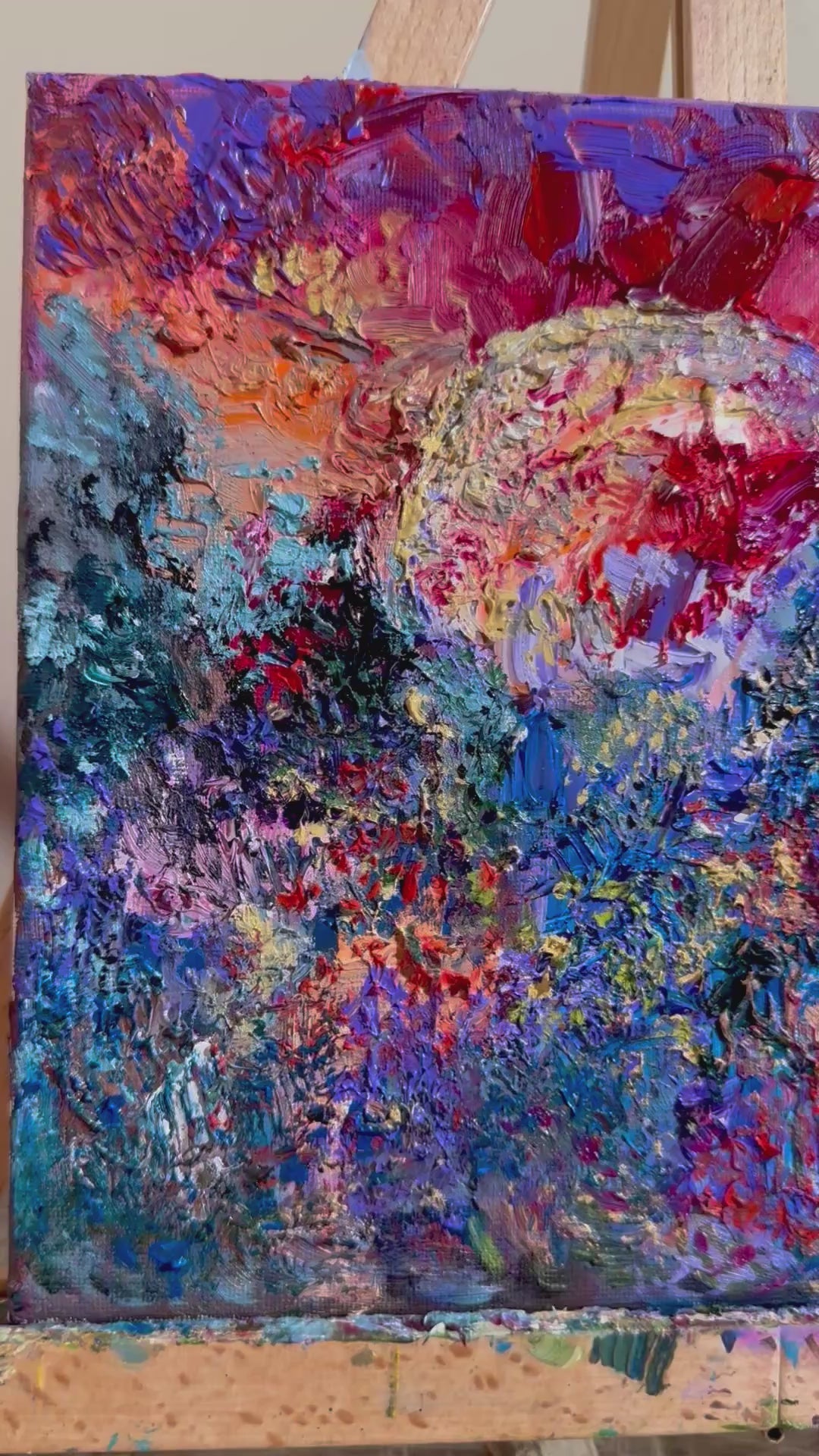 This painting was inspired by the surreal beauty of a big blood-red moon rising into a blue forest night. Dark pine trees stretch skyward, still and shadowed beneath the glowing sky. Painted in bold, textured strokes and expressionist tones, this piece evokes mystery, stillness, and a touch of the otherworldly.
