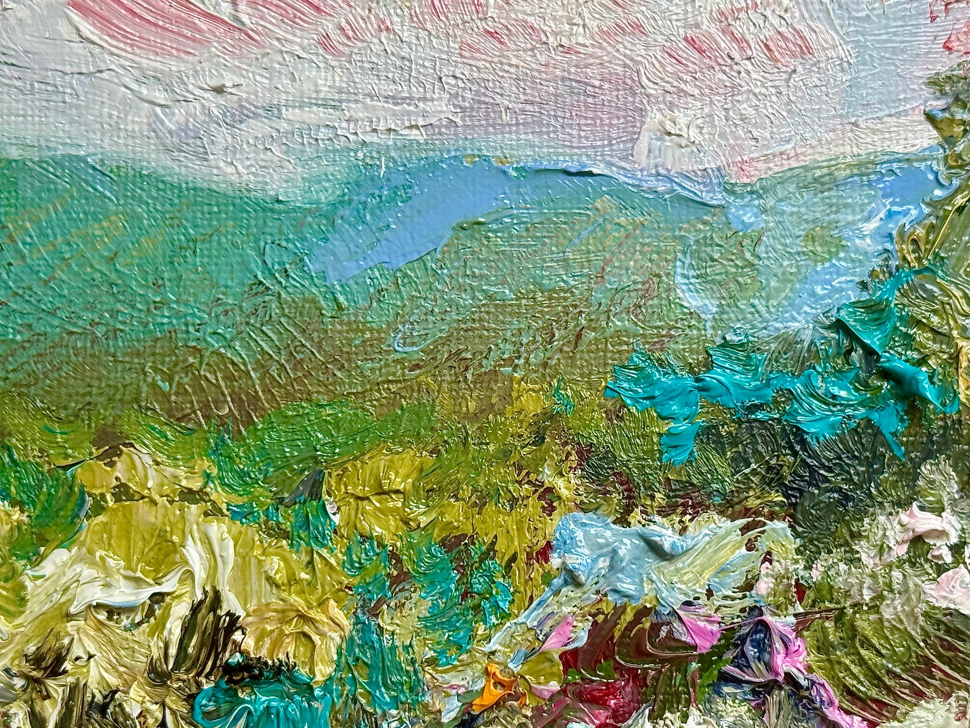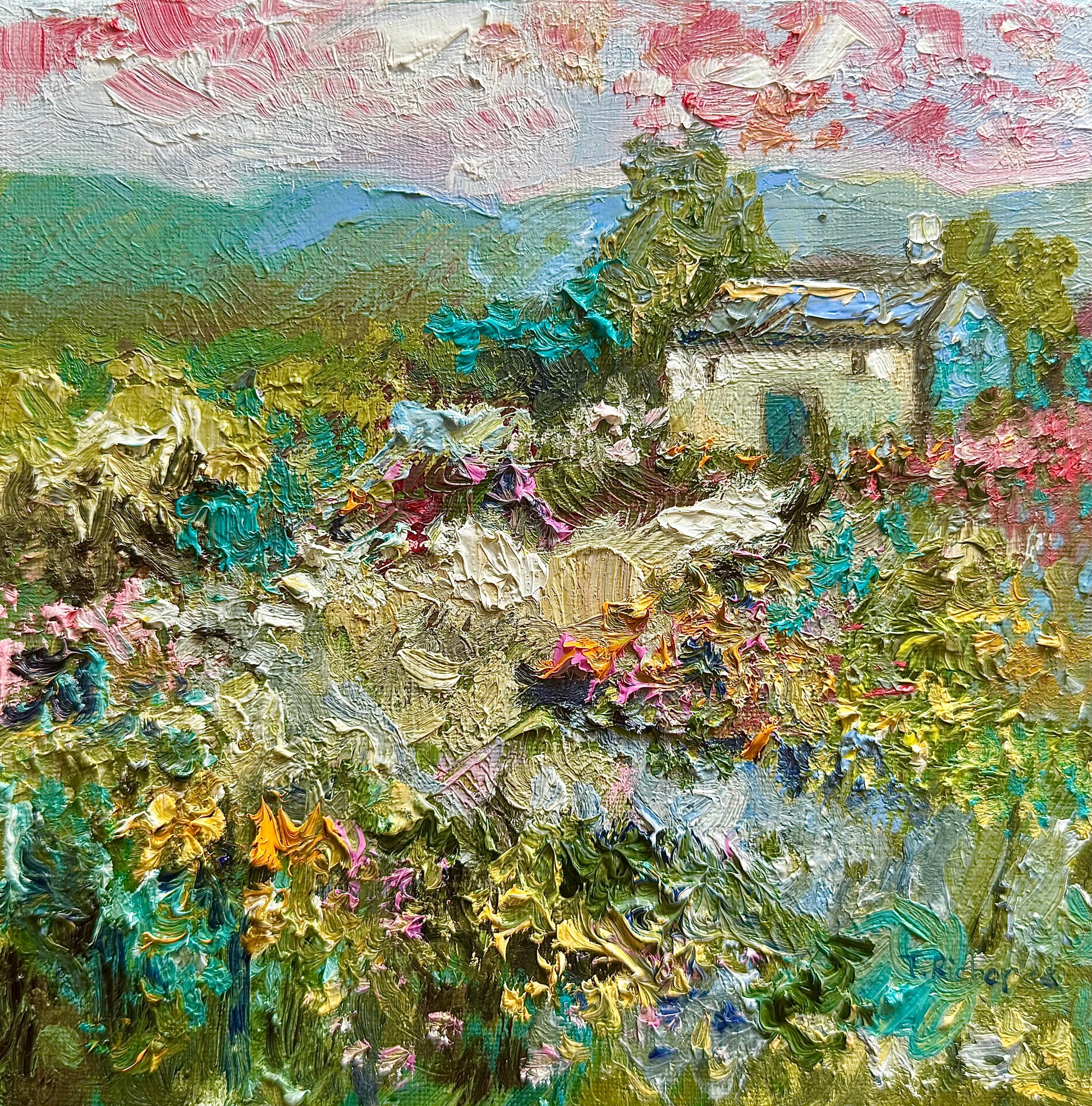 A peaceful mountain view with a charming countryside farmhouse nestled among soft fields and trees. Painted with warm, inviting colors, this landscape captures the stillness of rural life and the beauty of open country.