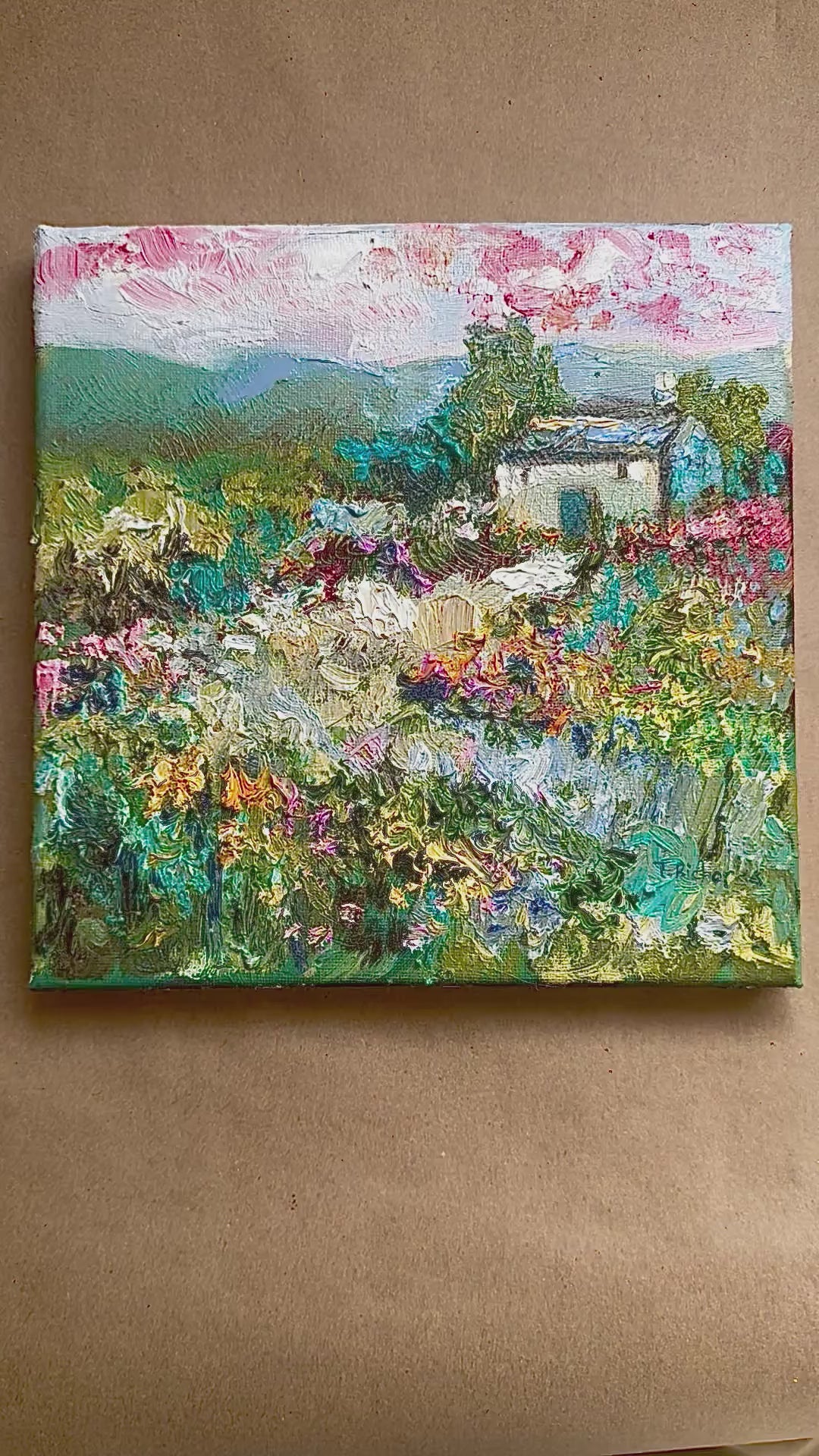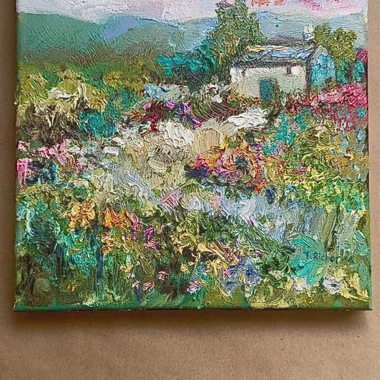 Countryside Farmhouse Oil Painting 8x8, Original Mountain Wildflower Landscape Artwork, Rustic Country Home Wall Art