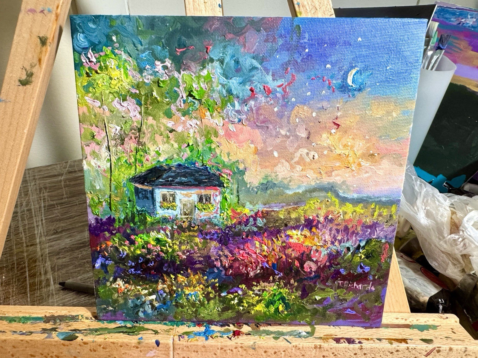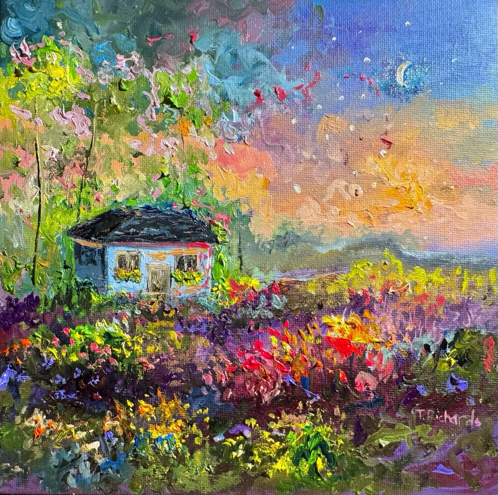 This oil painting was inspired by cozy cottages and flower gardens, 8x8" original oil artwork on canvas panel.