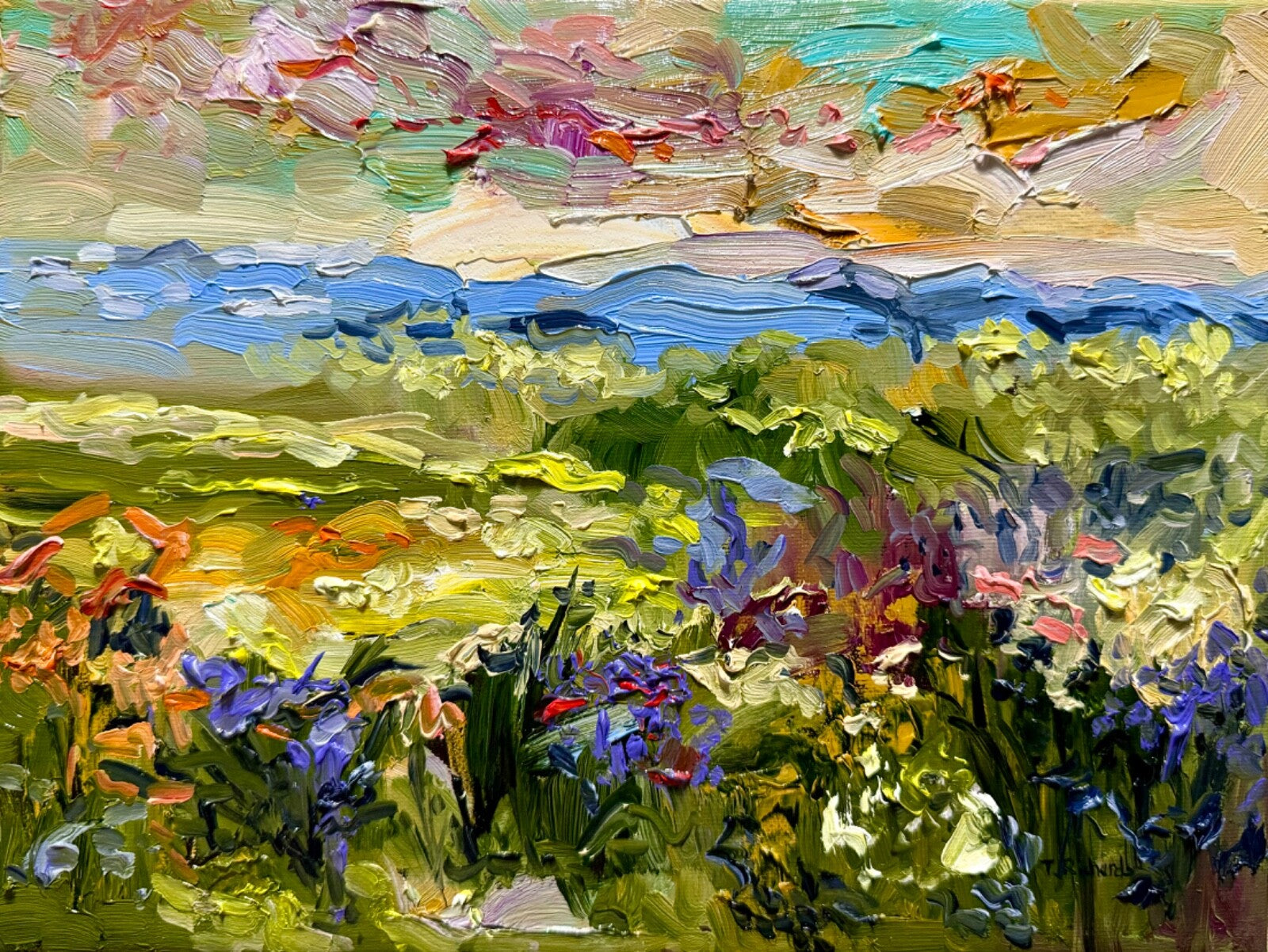 Field painting ORIGINAL art Landscape mountain artwork Floral wildflower 9x12"