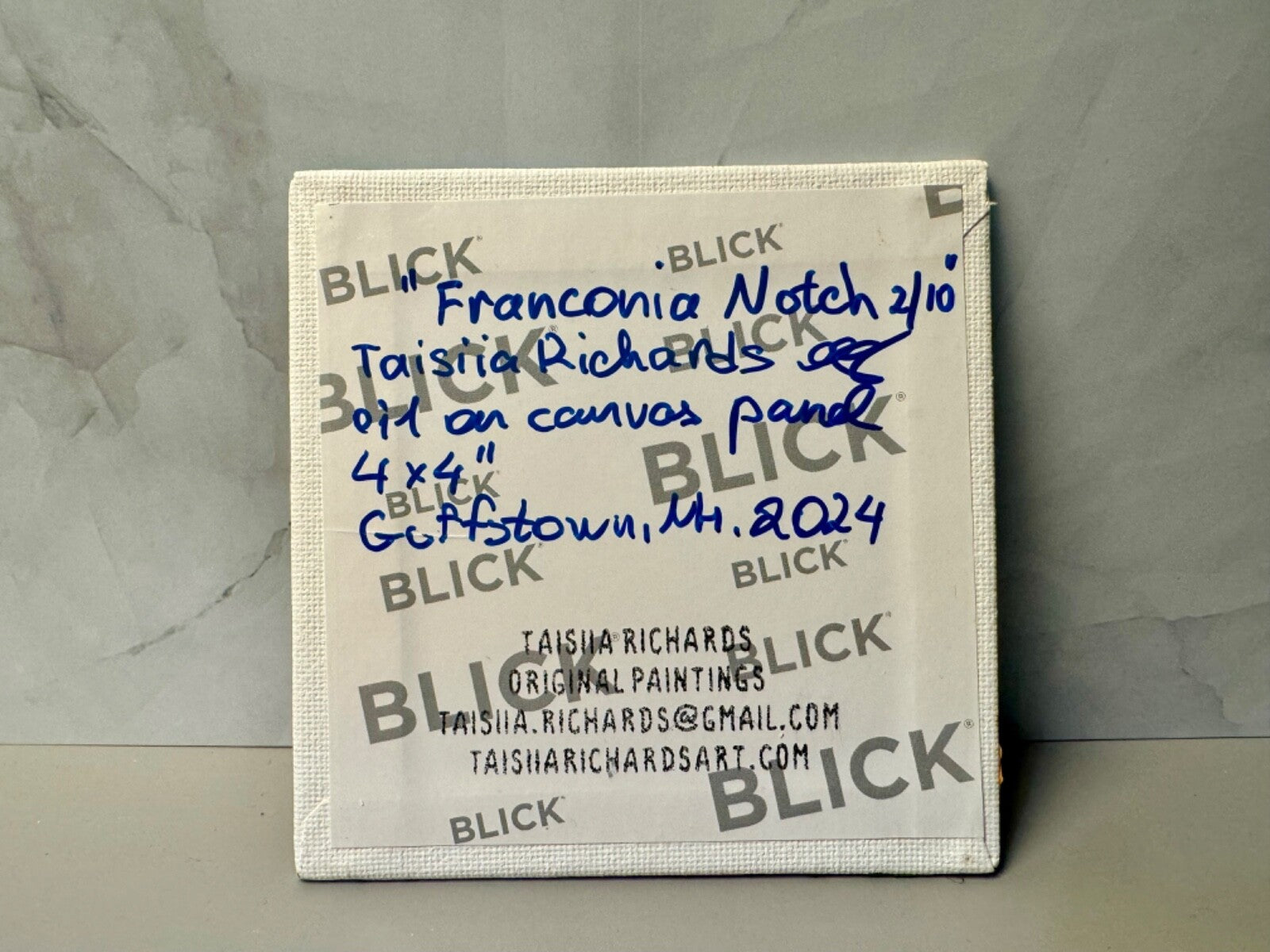 "Franconia Notch 2/10" oil painting, 4x4" original art, handmade small painting, oil on canvas panel. You can choose an option with the mini easel (5.9x3.2") for easy display on your shelf! Part of the Franconia Notch art series, currently in work.