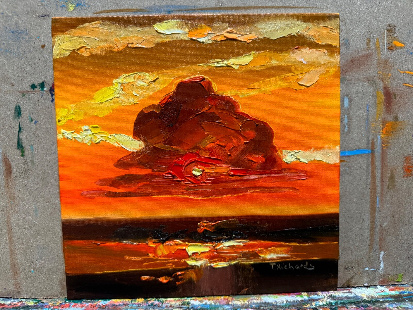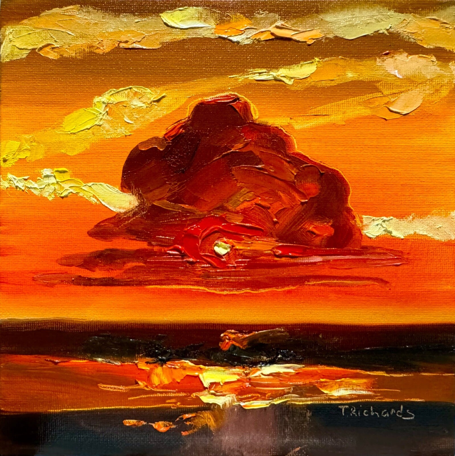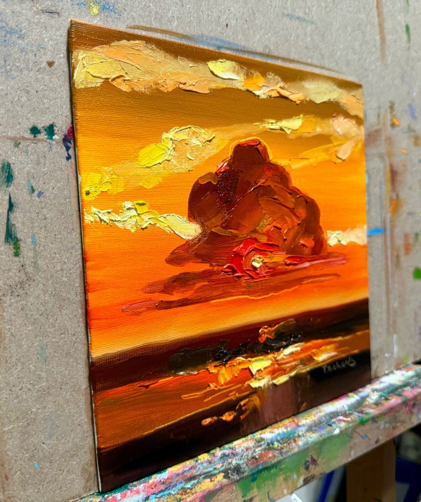 This piece of art is an original oil painting by Taisiia Richards. Measuring at 8x8 inches, it features a serene and breathtaking landscape of the ocean with a beautiful sky and clouds in the background. Ocean sunset inspired by Kuindzhi. The painting is done on a canvas panel and has been signed by the artist herself.