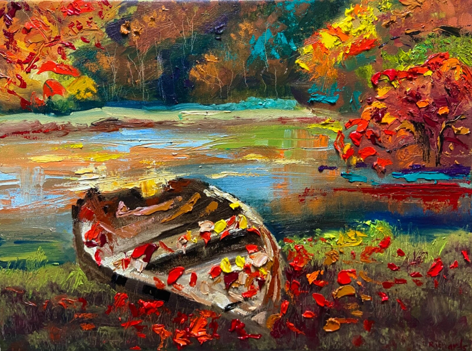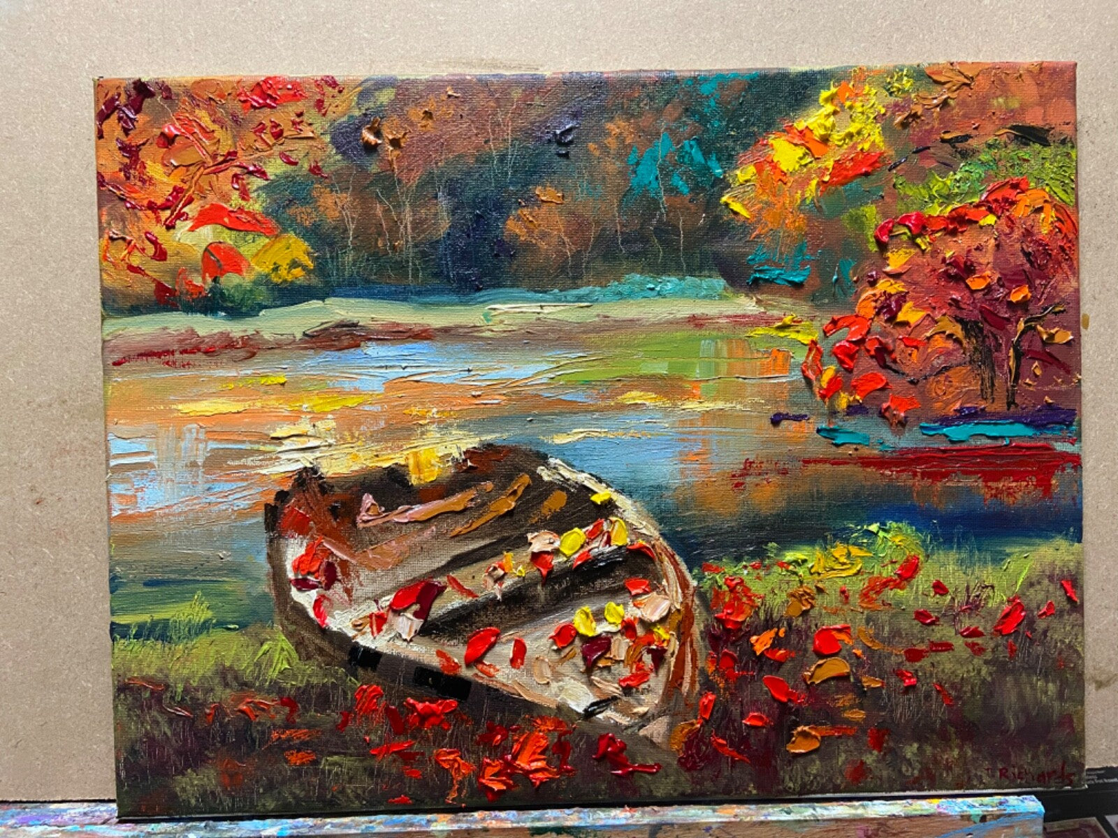 Oil painting ORIGINAL art Boat Fall landscape New England lake river 12x16"
