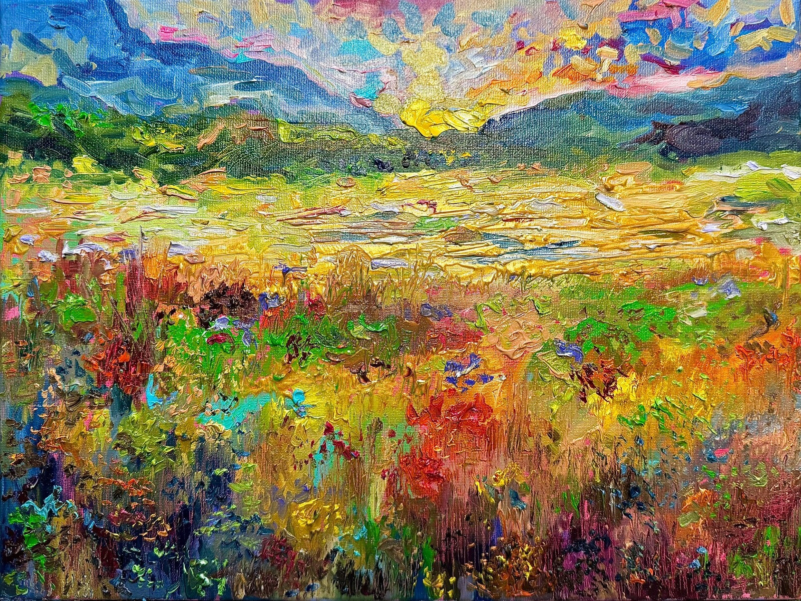 Wildflower field landscape oil painting, 12x16" original art, handmade painting, oil on canvas. Hand-painted!