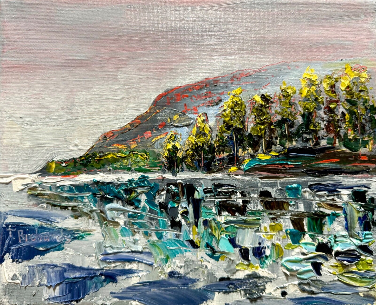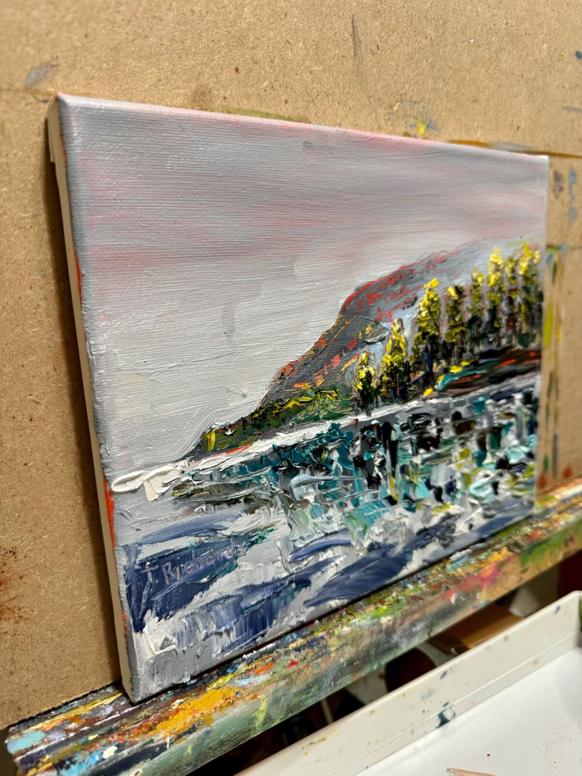 This landscape oil painting by Taisiia Richards captures the breathtaking scenery of a moody seascape morning in a lake forest.
