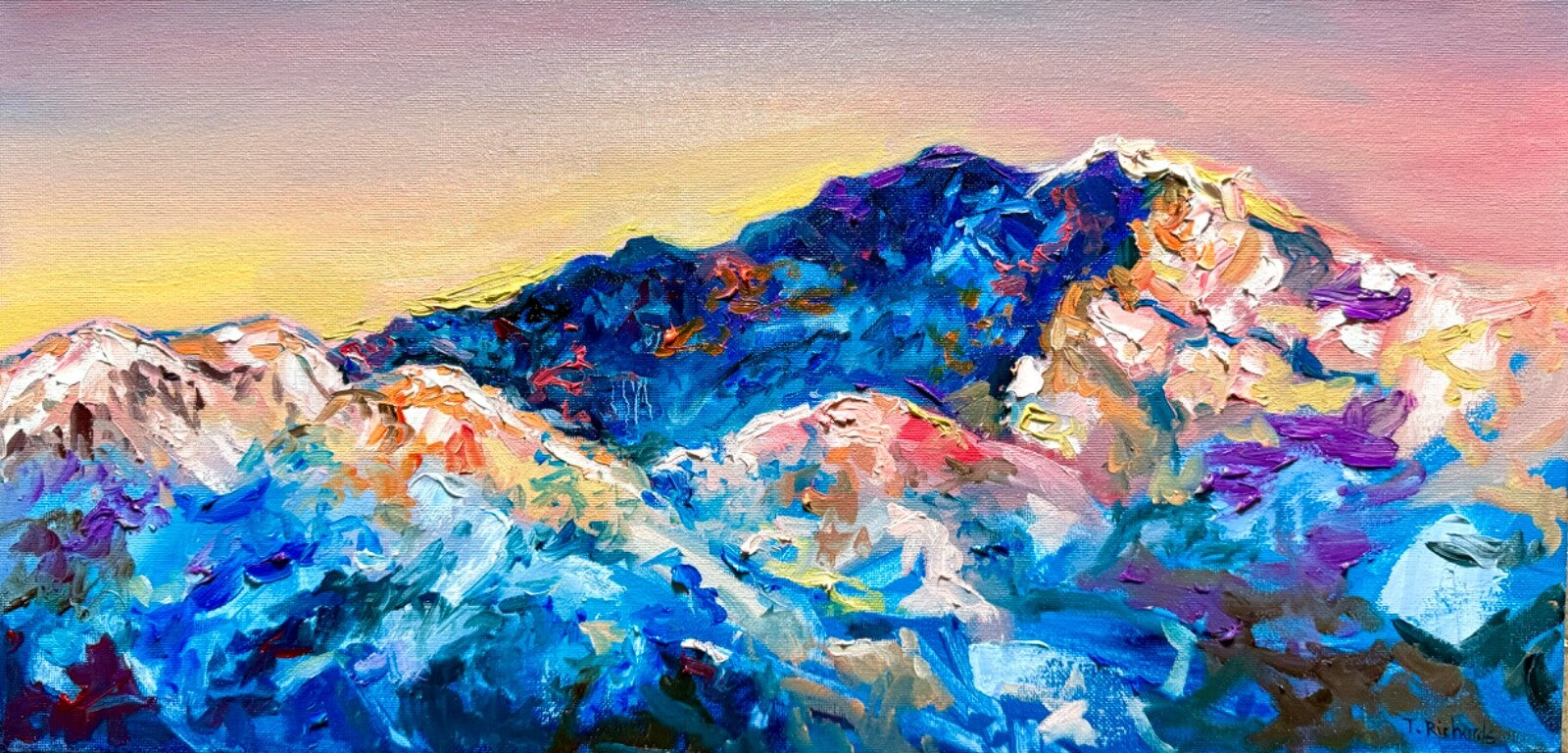 This 10x20" oil painting on canvas is an original artwork by Taisiia Richards. The ultra-contemporary piece features a breathtaking landscape of a mountain range and the sunrise in the sky. The canvas is made of high-quality materials and was painted using oil painting techniques, making it a one-of-a-kind piece.