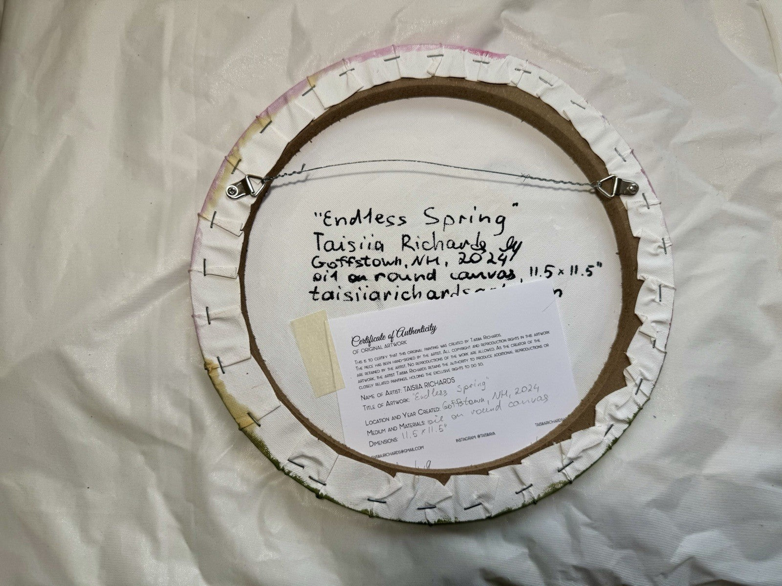 "Endless Spring" oil painting 11.5x11.5" original art, handmade painting, oil on round canvas. Hand-painted meadow field, inspired by New Hampshire landscapes.