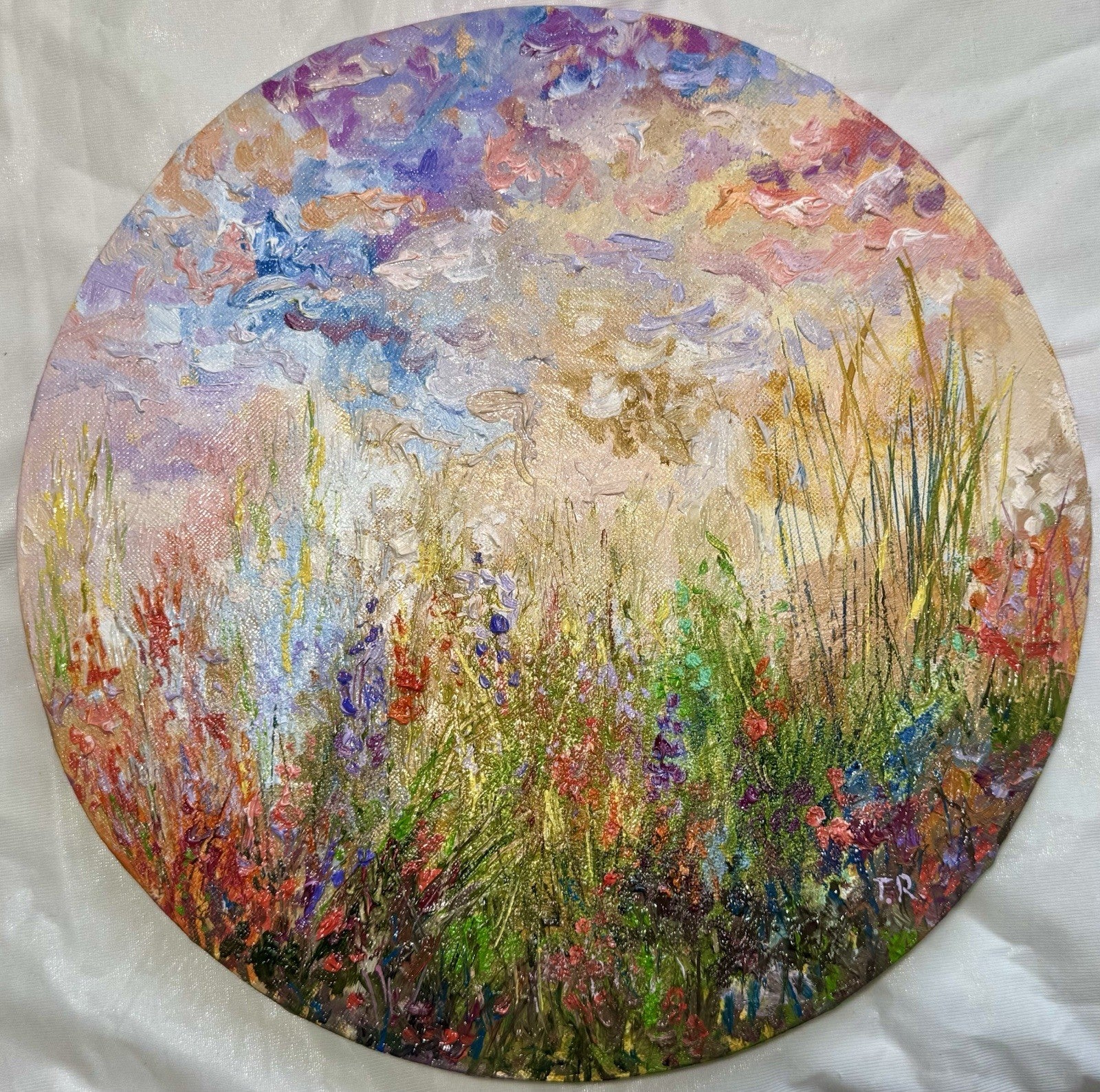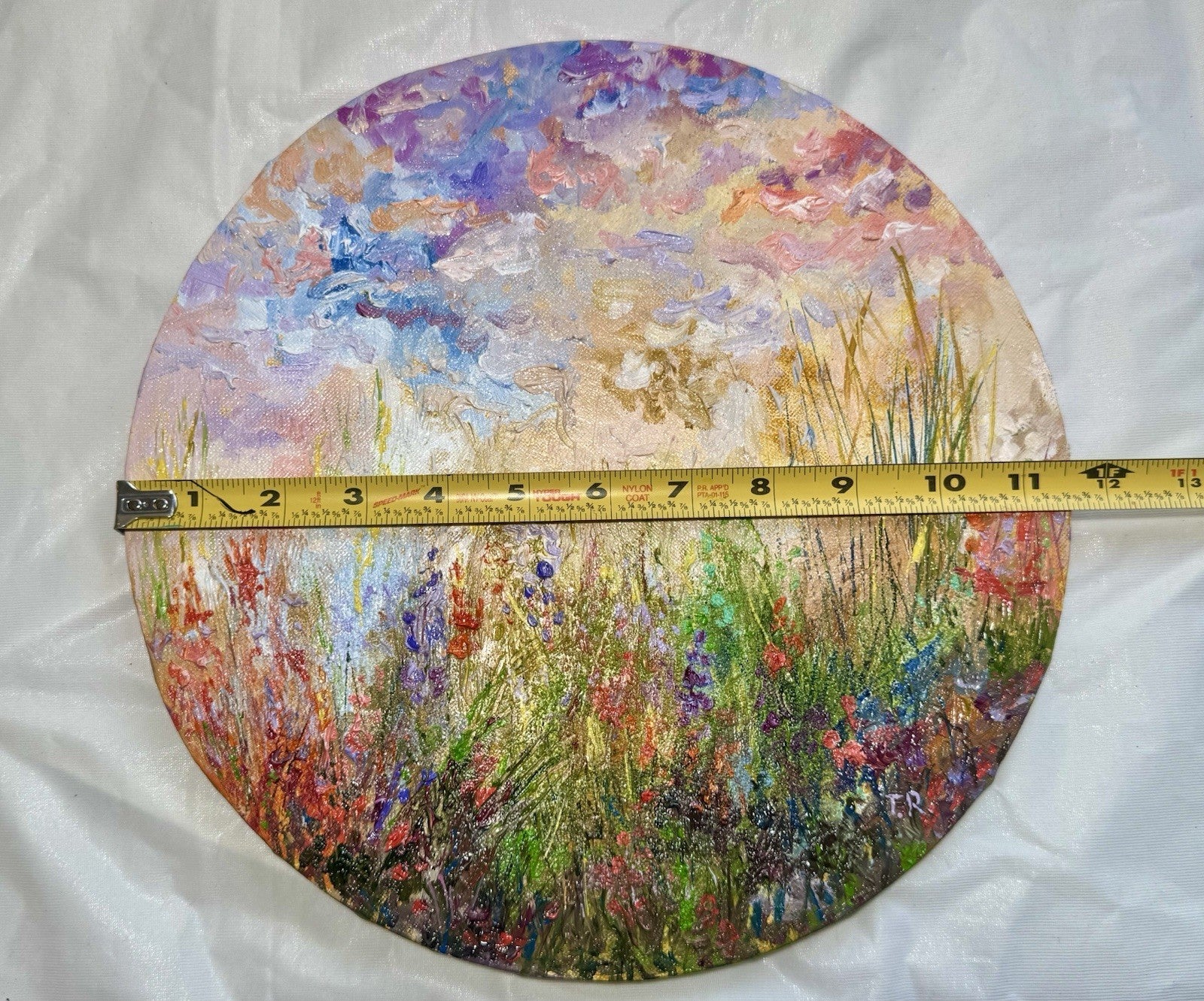 ORIGINAL art oil painting Floral meadow Flower field Round canvas artwork 11.5"