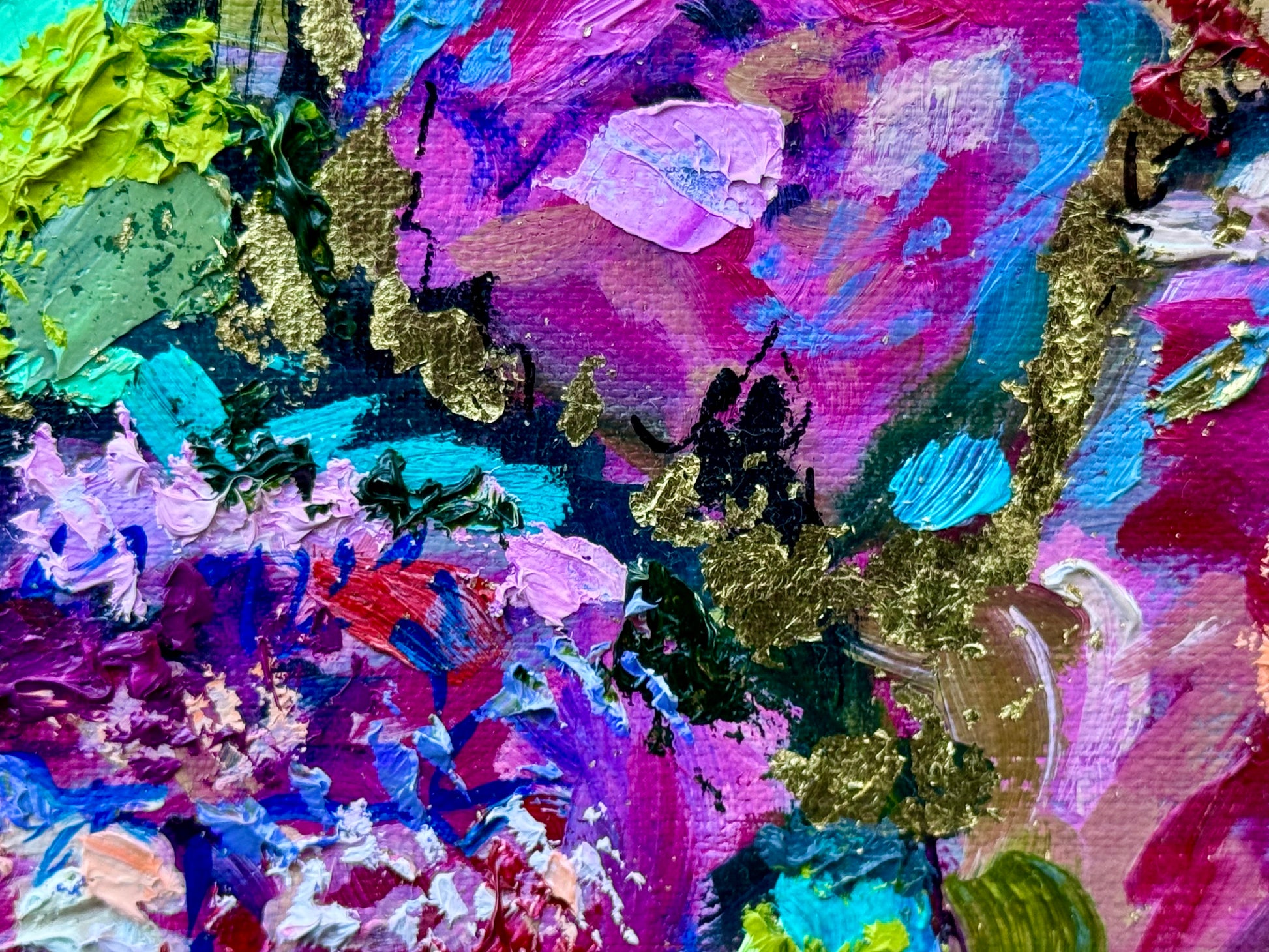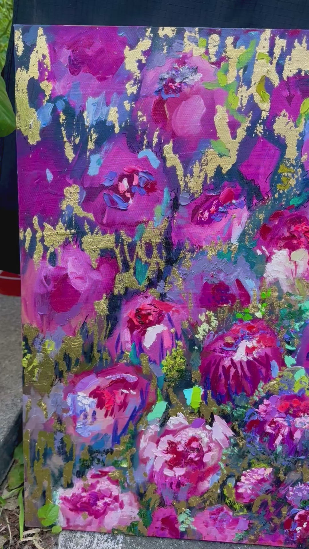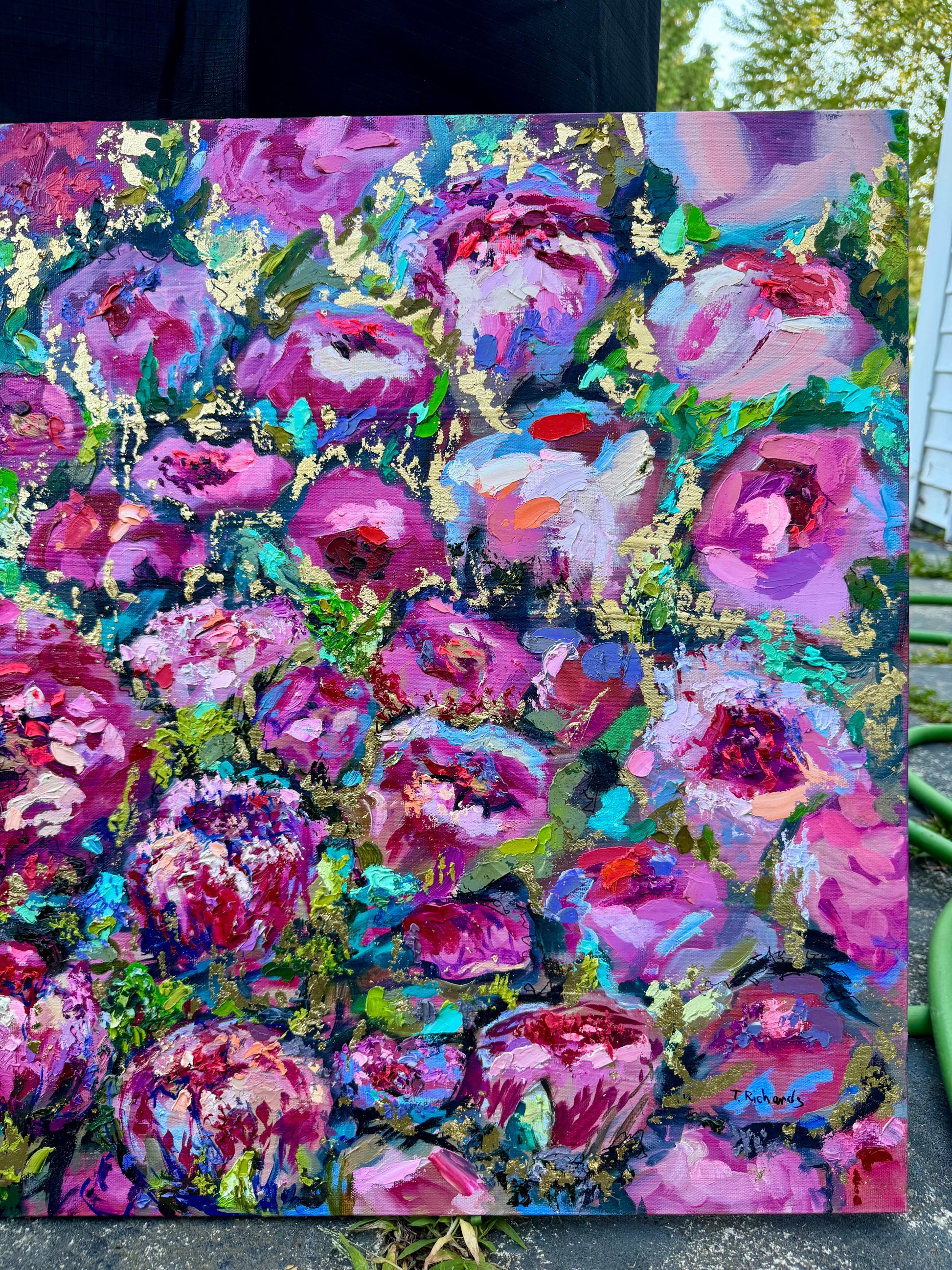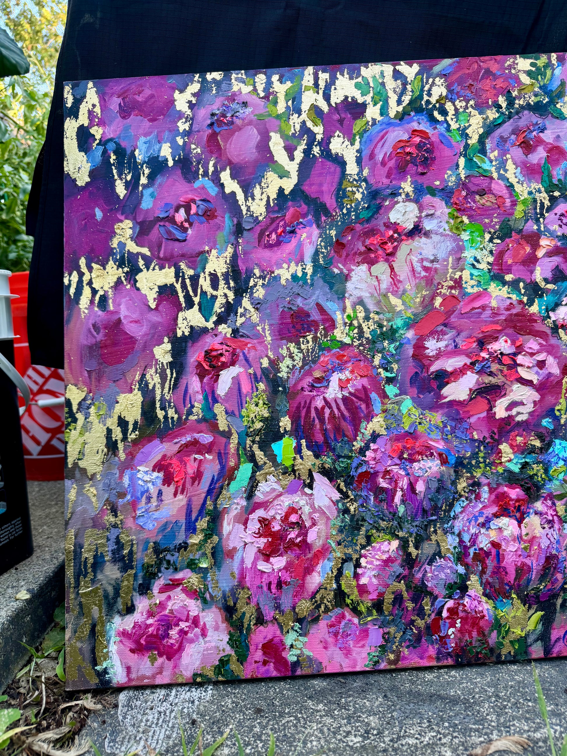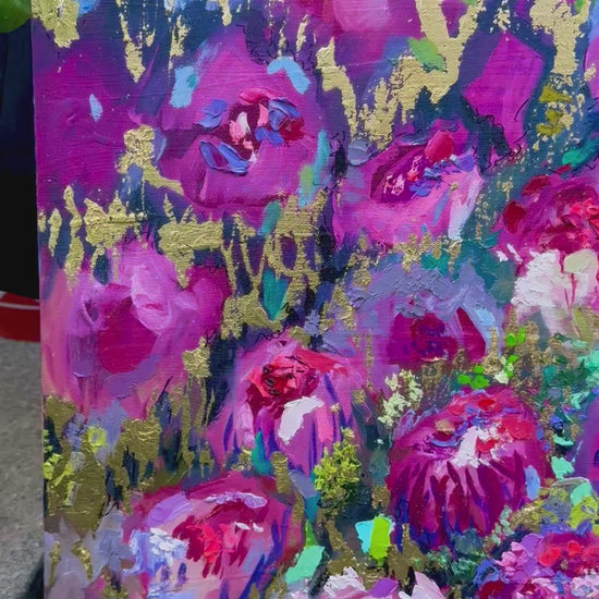 An elegant composition of blooming peonies shimmering with delicate touches of gold leaf. The soft petals unfold in harmony with warm, luminous tones, bringing an atmosphere of grace and quiet beauty to any space. This large original painting captures both opulence and serenity in every brushstroke.