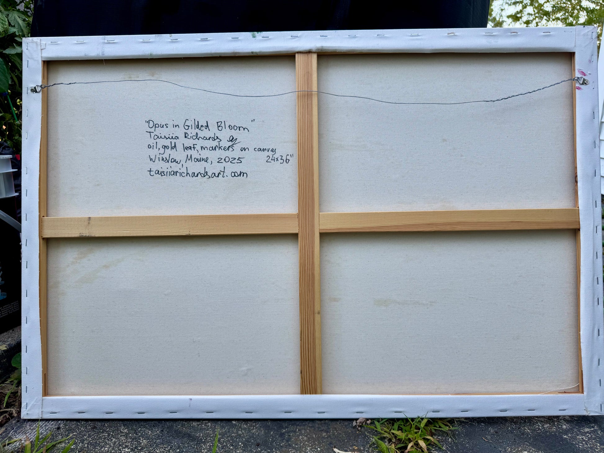 Medium: Oil, gold leaf, markers on stretched canvas.