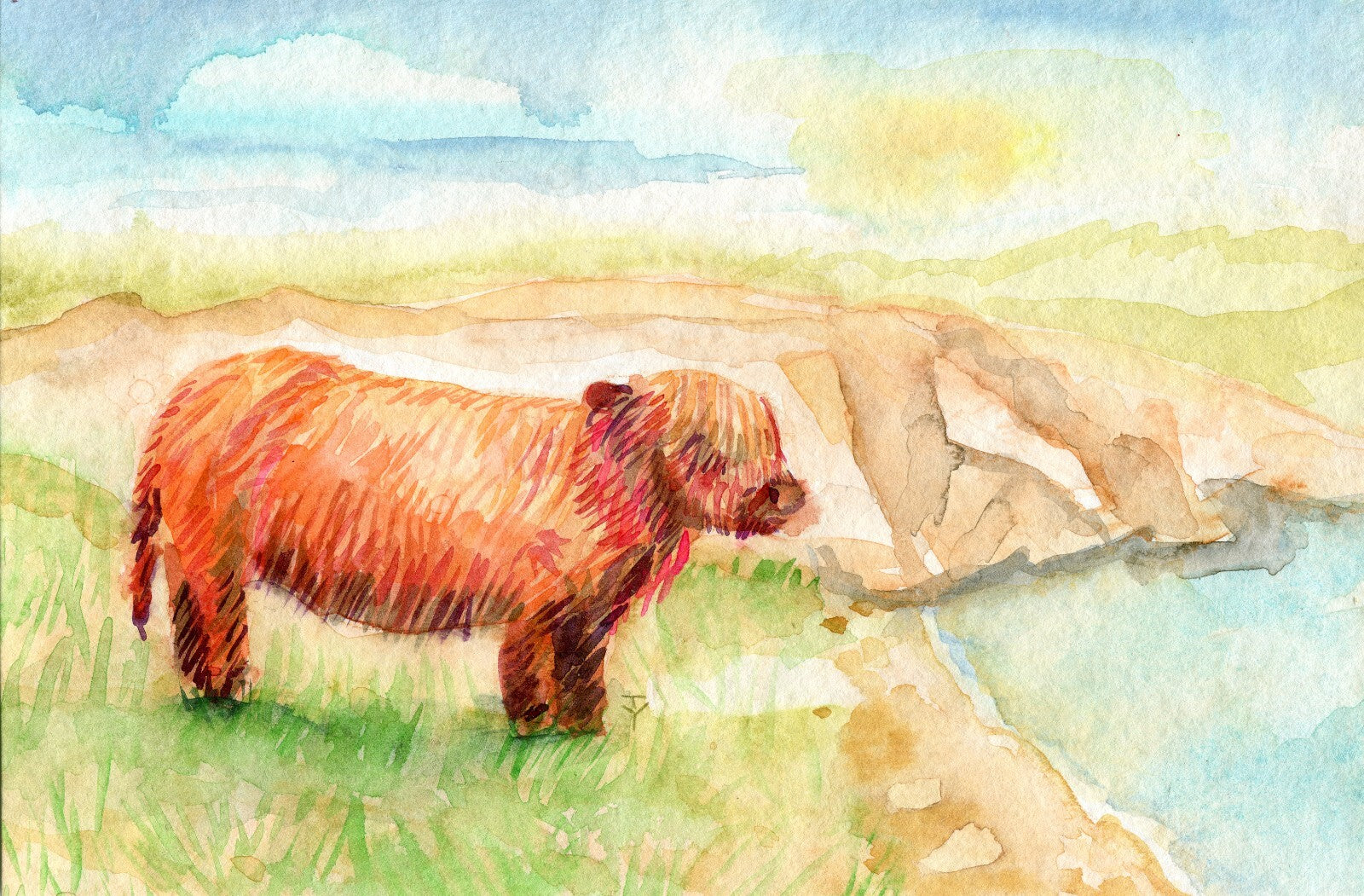 Watercolor painting ORIGINAL art Highland cow landscape 6x9"