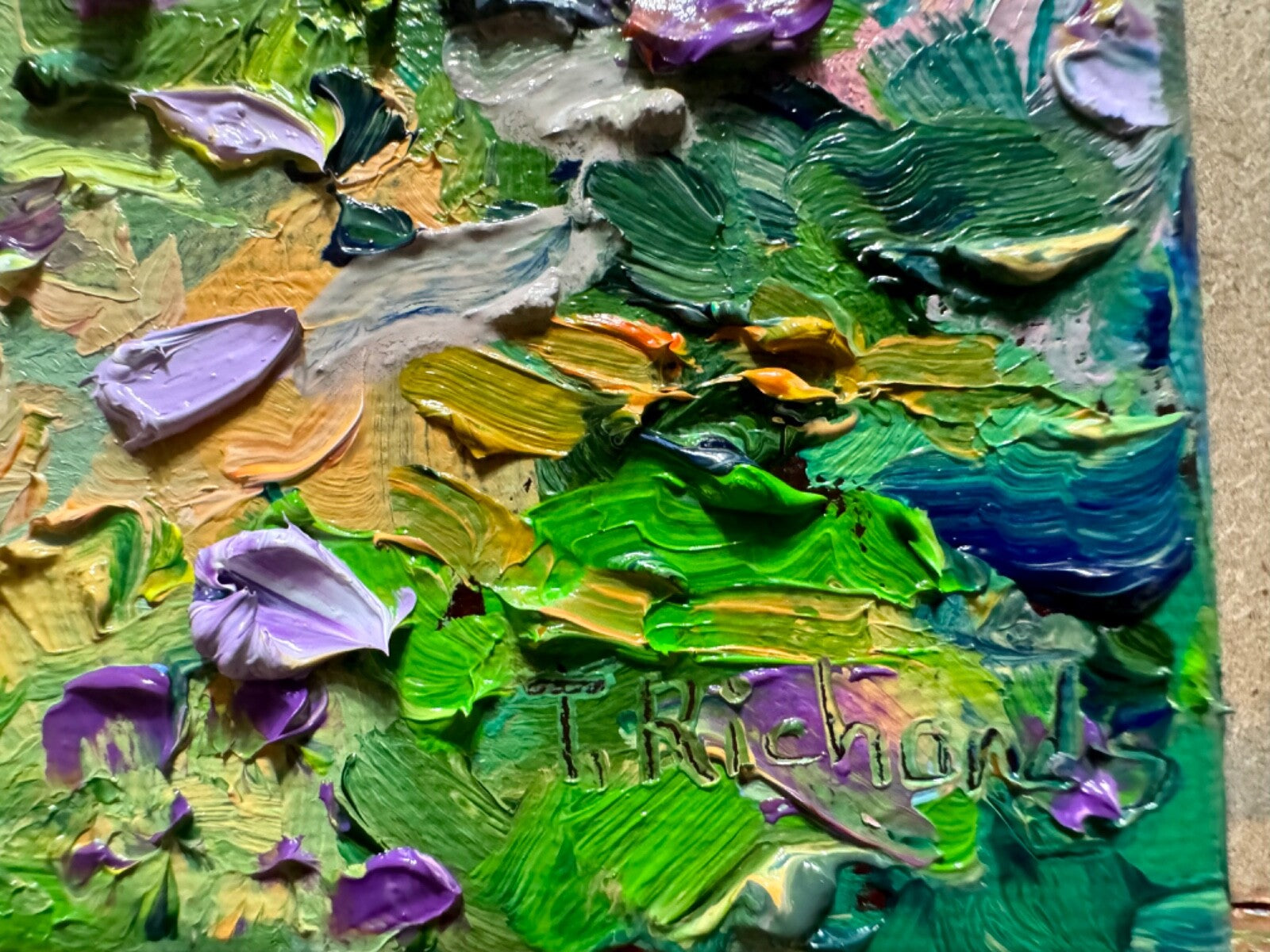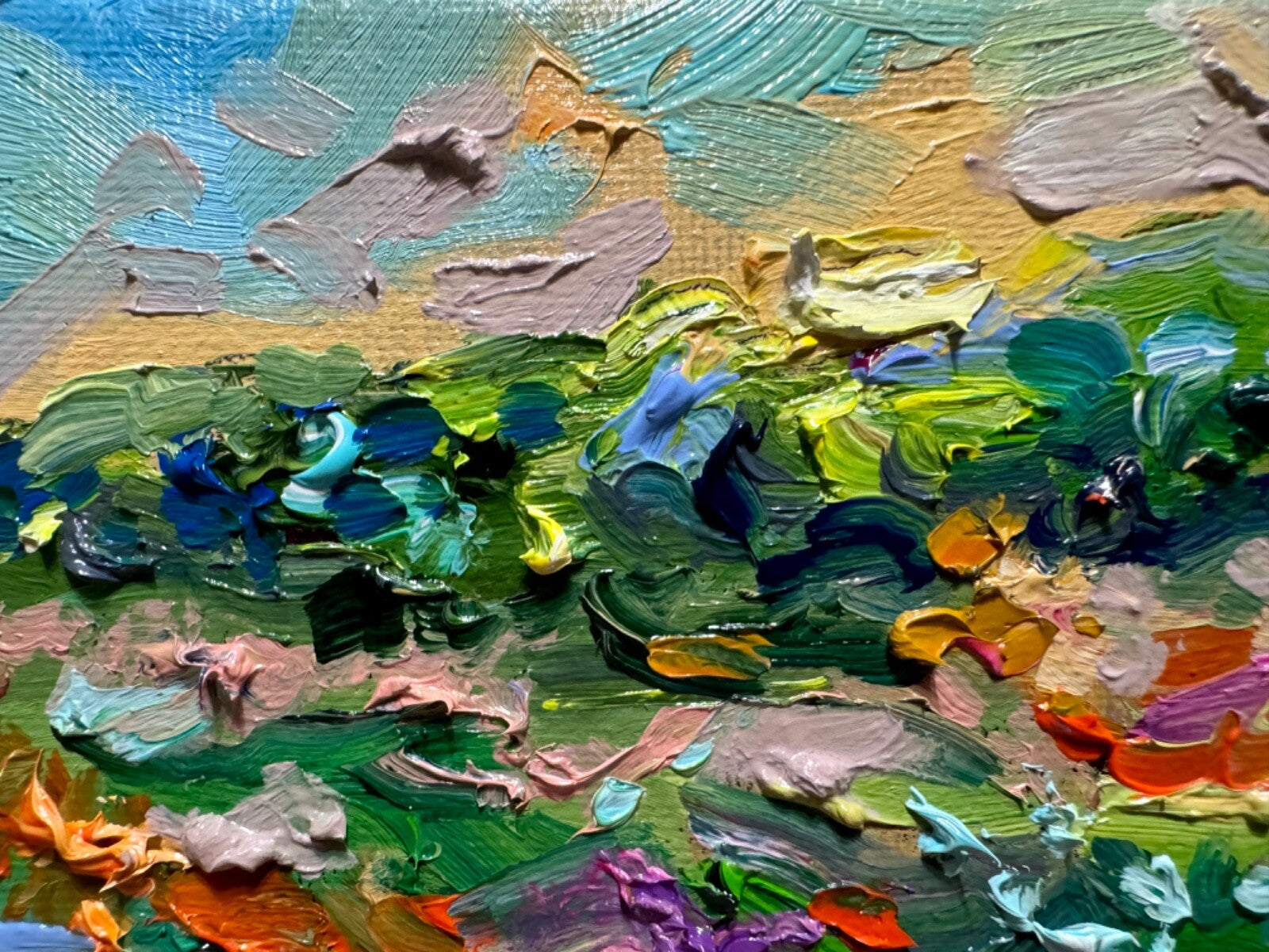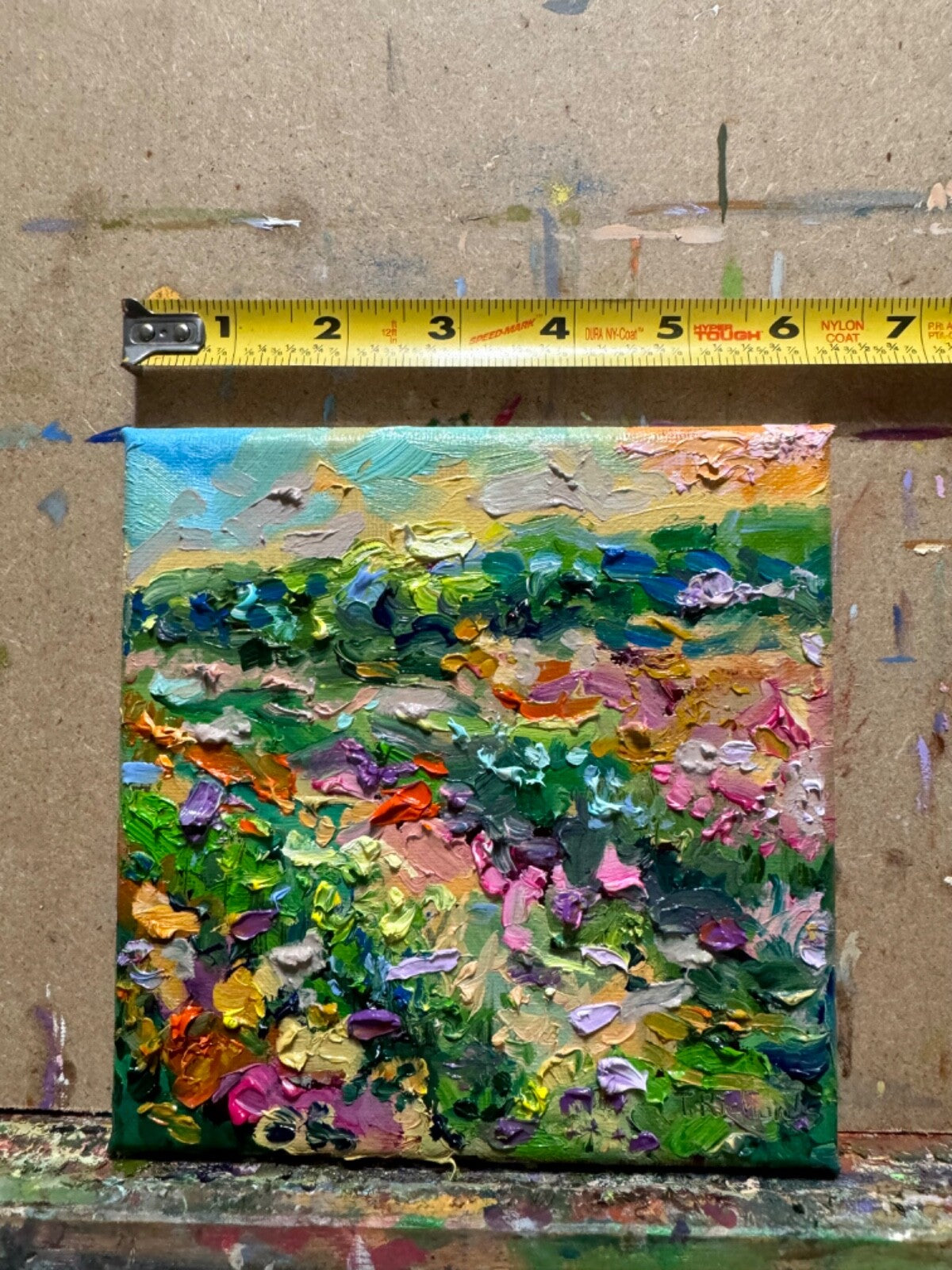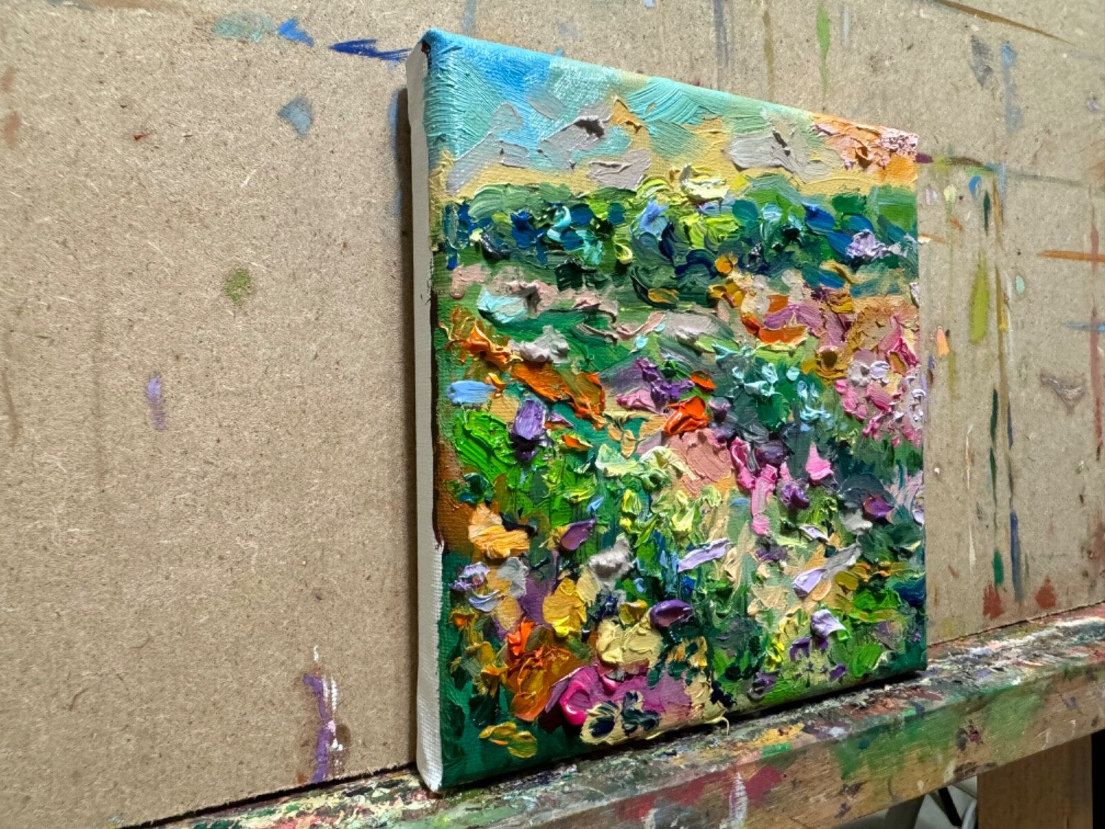 "Flower Fields of Provence" oil painting was inspired by New Hampshire wildflowers and lupines fields, 6x6" original artwork on canvas, 5/8" depth of stretcher bar. Thick impasto strokes and a combination of painting techniques of oil paints. It's part of the New Hampshire wildflower series.