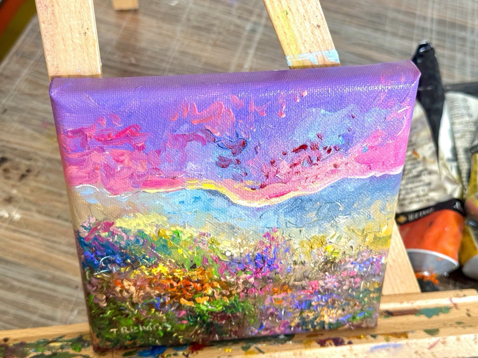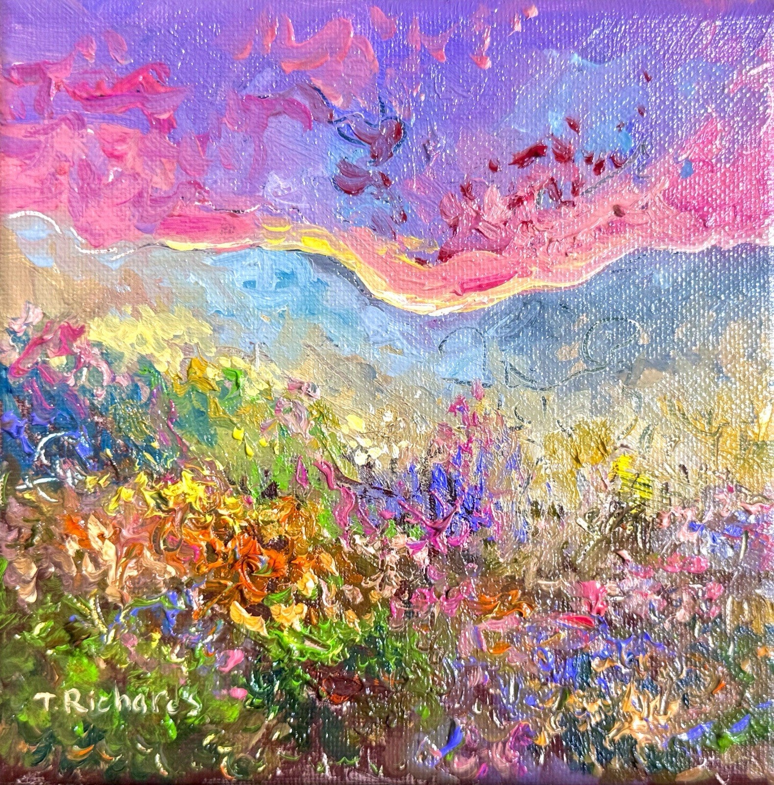 This original oil painting depicts a wildflower field with a mountain sunset in the background. The piece measures 6x6 inches and is signed by the artist, Taisiia Richards. It is a one of a kind handmade painting made on canvas and is unframed.